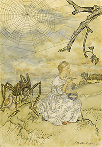 落ちついてヨーグルトを食べていたら,クモが近くにやってきてびっくりした女の子の話。このマザーグースによって,クモと言えばマフェットちゃん,マフェットちゃんと言えばクモというイメージが英語圏にはあるそうです。また「無防備にしていたら,なにか大きな災難がふりかかってきた」という例えにも使われます。この詩の作者は,16?17世期に実在した昆虫学者のトマス・マフェット氏だという説もありますが,定かではありません。