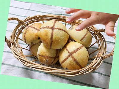 hot cross bunは4月のイースター(復活祭)には欠かせない,十字のついた丸いパンです。人々はこのパンを,イースターの前々日の金曜日,グッド・フライデー(Good Friday)の朝に食べます。グッド・フライデーとはイエス・キリストが十字架にかけられた日であり,キリストの受難を思ってこの十字のついたパンを食べる習慣があるのです。「1こ1ペニー,2こでも1ペニー」なのは,そのような宗教的な意味があり,値段は特別つけられないということなのでしょう。このhot cross bunには,魔よけや幸せをもたらす力があるともいわれています。