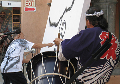 墨絵の心を伝え,その魅力を知ってもらうために,「墨絵ライブ」というパフォーマンスも続けています。大勢の人びとの前で,大画面に即興で墨絵を描くというもので,これまでにアメリカで10か所,日本で20か所以上で催しました。シアトルでの講演のとき,キングサイズのシーツに描いたのが始まりでした。講演やワークショップも行なっていて,墨絵の楽しさを味わってもらっています。ぼくのホームページでも墨絵の魅力を楽しんでください。