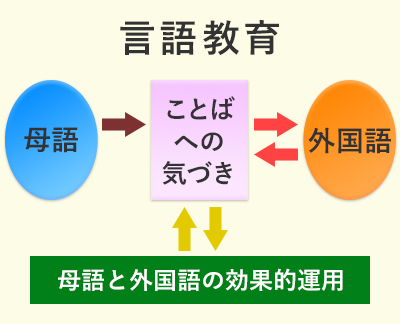 母語について知ることによって,ことばへの豊かな気づきが身につく。培われたことばへの気づきをもとにして,外国語を学んでいく。それによって英語が使えるようになる。