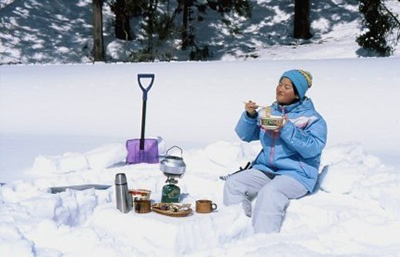 雪の森遊びに欠かせないのが,スノー・テーブル。携帯用のスコップで,好みの形に足を入れるスペースを掘りこみます。ひと汗かいたら,お茶とお菓子でティータイム!