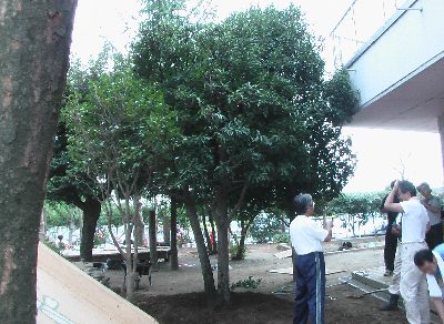 先週より実作業が始まり、今週から父兄に手伝いのアナウンスがあって、毎土曜日か日曜日に、協力できる父兄が集まって作業していく。きょうは、建設予定地の聖地の一環として、大きく成長した大木を移植する作業だった。幹の回りに土を残して土台となる根っこを、直径1m位残して掘り起こし、移植先まで砂場の迂回を含めて都合15m位、有に1トンは越えているであろう巨木を移動させなけばならない。