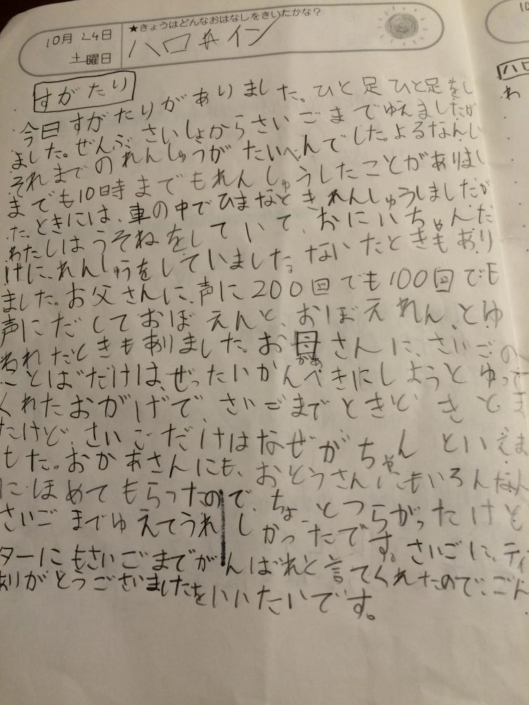 小二のKちゃんがおはなしにっきにハロウィンの時のレシテーション《暗唱大会》の時のお家での頑張りについて書いてきてくれました。