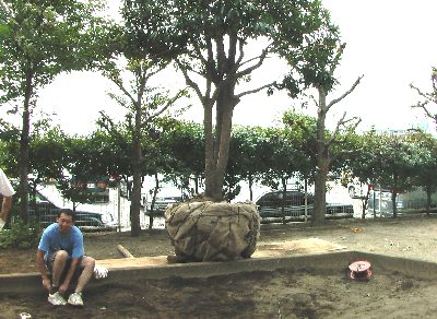 先週より実作業が始まり、今週から父兄に手伝いのアナウンスがあって、毎土曜日か日曜日に、協力できる父兄が集まって作業していく。きょうは、建設予定地の聖地の一環として、大きく成長した大木を移植する作業だった。幹の回りに土を残して土台となる根っこを、直径1m位残して掘り起こし、移植先まで砂場の迂回を含めて都合15m位、有に1トンは越えているであろう巨木を移動させなけばならない。