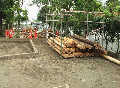 「その」40周年を記念して、手作りによる大型遊具「船のアスレチック」の建設が進められています。今日もその作業に参加させていただきました。先週は自分は仕事で参加できませんでしたが、名栗村の山林から無償で頂いてきた間伐材を、今日は寸法を出して皮を剥くと云う作業が行われました。