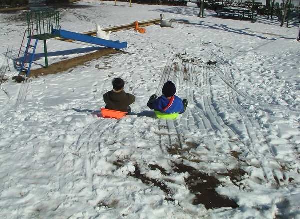 近場にある大きな5号公園がソリに向いているかもとの情報をいただきました。でも、あそこの山は土がむき出しだったよな?と思い出し、元旦の天気は徳上で気温もそこそこ上がりだし、近所の屋根に積もった雪もどんどん溶け出している様子。土山はきっとすぐに溶けてドロだらけになってしまうのでは?と考えて、まがいなりにも芝生の山があるロケット公園を目指しました。ラッキーなことに遊んでいるお子さん達はいなくて、バージンスノーを独占することができました。山は決して大きくありませんが、それなりにスピードが出て、息子さんたち1回やったらすっかりお気に召して、何回も何回も繰り返していました。