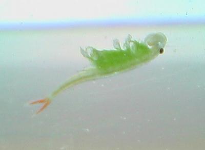 これが、今日連れ帰ってきた豊年エビです。背泳ぎしているところです。緑色の足は、食べた草からの葉緑素が溜まったものだそうです。本来は透明の体に、尻尾だけおしゃれに赤く染め抜いて・・・