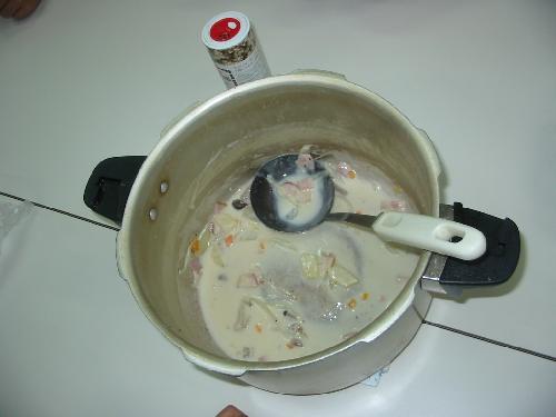 私は、きのこスープのクリームベースをお鍋に作って、運んできました。