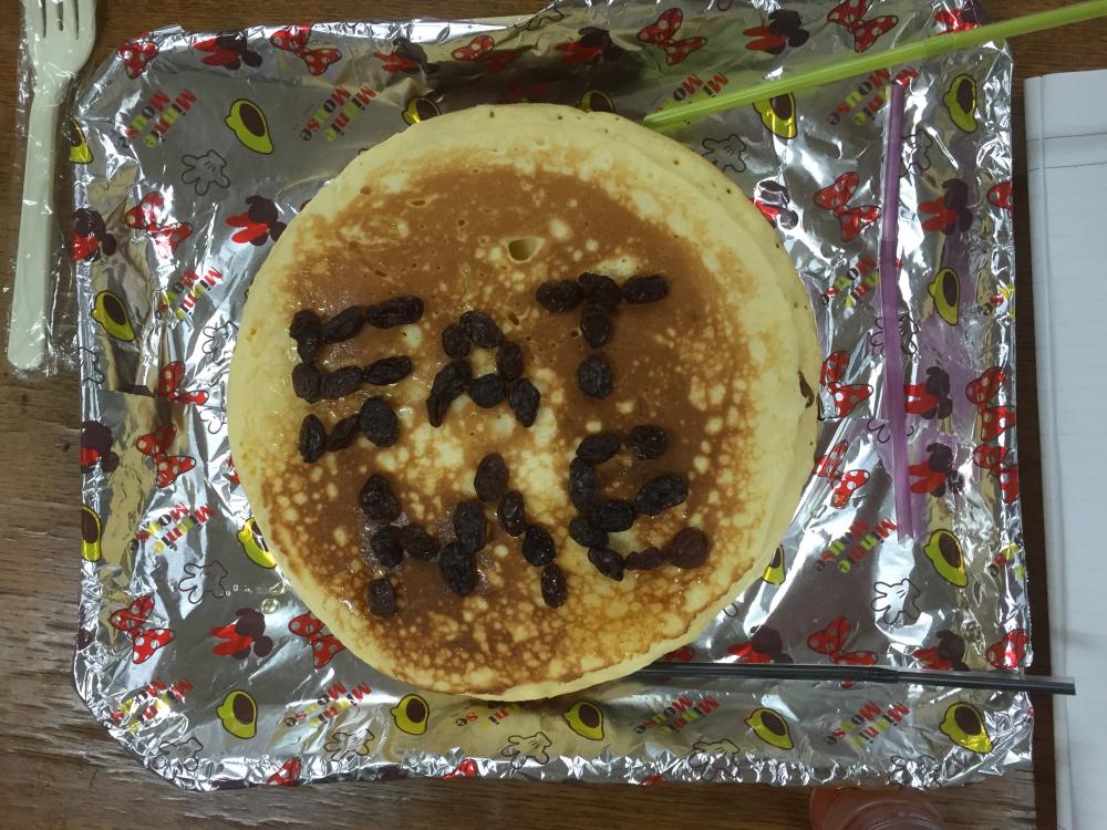 お母さんがおうちでホットケーキを焼いてきてくださったので、そこに干しブドウで"EAT ME"と書いてみました!