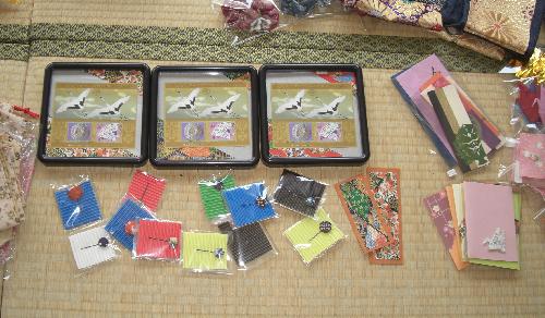 五円むすびホルダー。穴の開いたコインは珍しいし、五円はご縁につながります。その意味を書いた紙と五円玉に紐を結んでホルダーにしたもの。5円玉には日本の第一次産業農業と第2次産業工業も図案の中に入っています。折り紙と飴が入って、出会った人に日本と自分を知ってもらえるように。今年は風呂敷が新登場。「包む」「結ぶ」って日本の文化だと思います。