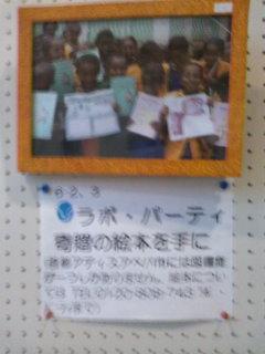 「ラボ・パーティ」発刊の絵本を図書館で見て、東京本部に問い合わせて絵本を贈呈していただきました。日立にもラボ・パーティがあったのですね、今自分達も多賀市民会館で「エチオピアのこどもたち」の写真展をしております。そこにラボ・パーティから寄贈して頂いた絵本を抱いているうれしそうな子供達の写真もあります。
