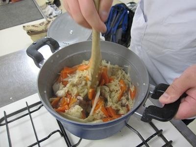 男の子4人と女の子ひとりというメンバーですが、料理大好き、週に何度か料理をしているという子供達だったので、炊き込みごはんの素は使わず、そして炊飯器がなくてもできるようにお鍋で炊きましたが、これがまた美味しくできました。手つきもよく、鶏肉もやわらかくなるようにと包丁で叩いていました!