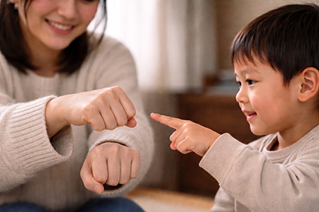 どんぐりや小さなおもちゃ、おやつなどを手に隠して「どっちかな?」と声をかける。