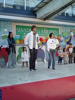 最初の英語の歌あそびでは、ステージに上がることを尻込みしていた客席の子どもたちも、大型絵本『はらぺこあおむし』の英・日の読み聞かせがはじまると「近くで見たい」「声を聞きたい」気持ちで、続々と舞台に上がってきてくれました。