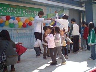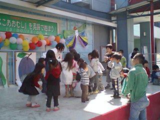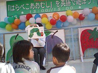 お話が終わったら、初めての子どもたちもCDにあわせて、「はらぺこあおむし」を劇遊び。とっても楽しく動けて、その後の英語の歌あそびももりあがりました。 |