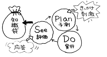たとえば,アメ玉をなめて甘かったという体験のある子が,アメ玉に似た(実際はアメ玉ではない)モノを「これはきっと甘いモノだ」と考えて(Plan),「なめてみる」(Do)と「これは甘くない」とわかる(See)。こうした予測しなかったことが起こると,子どもはすぐにはじめのプランを修正し,次からはアメ玉に似ているけれどよく見ると少し違うモノはなめなくなります。このように「PDSサイクル」をまわしていくことで,常に瞬時に新しいことを学習していきます。